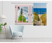 Set Draperii ECOfabric realizate din 100% poliester reciclat post-consum, semitransparent, greutate textil 210g, culori vii rezistente la spalat, pot fi calcate, finisate cu rejansa lata de 6,5 cm din bumbac, imprimate digital.