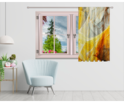 Set Draperii ECOfabric realizate din 100% poliester reciclat post-consum, semitransparent, greutate alb 210g, culori vii rezistente la spalat, finisate cu rejansa lata de 6,5 cm din bumbac, imprimate digital.