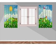 Set Draperii ECOfabric realizate din 100% poliester reciclat post-consum, semitransparent, greutate textil 210g, culori vii rezistente la spalat, pot fi calcate, finisate cu rejansa lata de 6,5 cm din bumbac, imprimate digital.