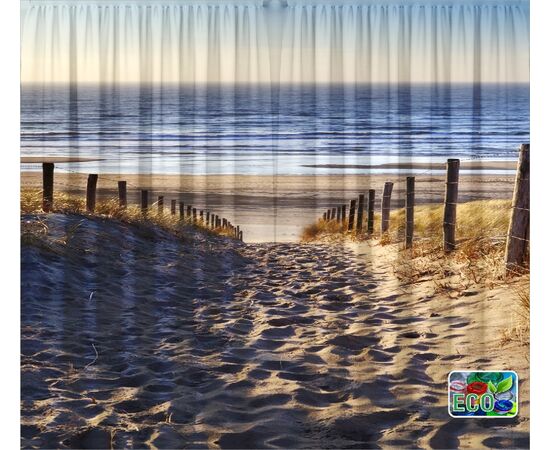 Set Draperii ECOfabric realizate din 100% poliester reciclat post-consum, semitransparent, greutate alb 210g, culori vii rezistente la spalat, pot fi calcate, finisate cu rejansa lata de 6,5 cm din bumbac, imprimate digital.