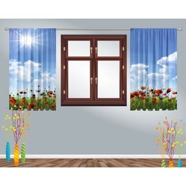 Set Draperii ECOfabric realizate din 100% poliester reciclat post-consum, semitransparent, greutate textil 210g, culori vii rezistente la spalat, pot fi calcate, finisate cu rejansa lata de 6,5 cm din bumbac, imprimate digital.
