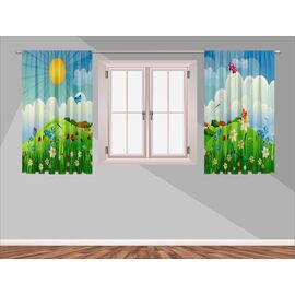 Set Draperii ECOfabric realizate din 100% poliester reciclat post-consum, semitransparent, greutate alb 210g, culori vii rezistente la spalat, finisate cu rejansa lata de 6,5 cm din bumbac, imprimate digital.