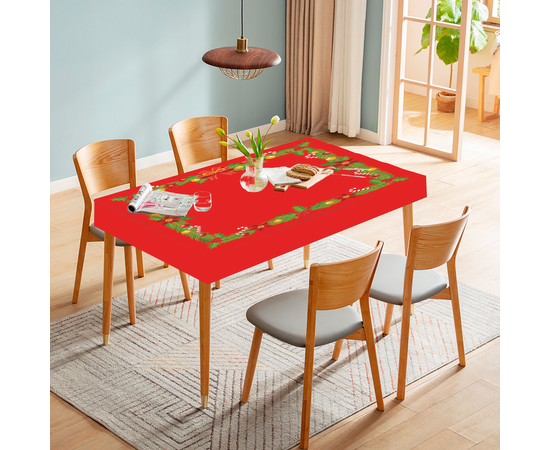 Fata de masa imprimata model Craciun, material semi transparent, lavabil, finisata cu tiv de jur imprejur, compozitie 100% poliester