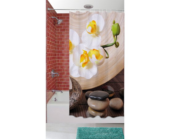 Perdea de dus BathLine textil 100% poliester, dimensiune 100x200 cm, impermeabila, prevazuta cu capse de plastic, poate fi spalata manual sau automat, imprimata digital cu cerneala ecologica. Nu contine carligele de agatat.