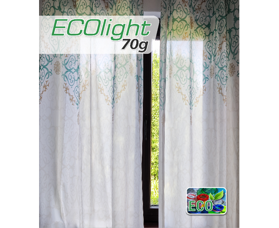 Perdea ECOLight '70' realizata din material textil de 70g/mp (nu este voal), cu tesatura deasa, subtire, putin satinat, asigura trecerea luminii dar ofera si intimitatea dorita, culori vii rezistente la spalat, poate fi spalata manual sau automat, se usuca rapid, poate fi calcata la temperatura joasa, imprimata digital cu cerneala ecologica pe baza de apa. Finisata cu rejansa de bumbac de 6.5 cm.