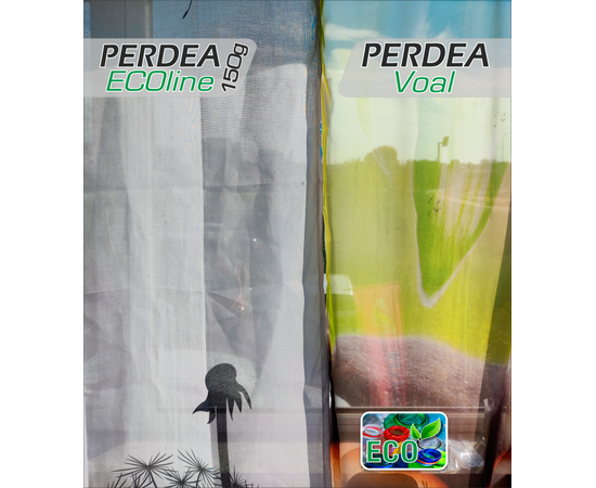 Set Perdele ECOLine semitransparente, permit trecerea luminii dar asigura intimitatea dorita, tesatura moale cu aspect de bumbac/in, realizate din poliester tesut 100%, greutate material 150g/mp, imprimate digital, culori vii rezistente la spalat, finisate cu rejansa lata de 6,5 cm din bumbac.